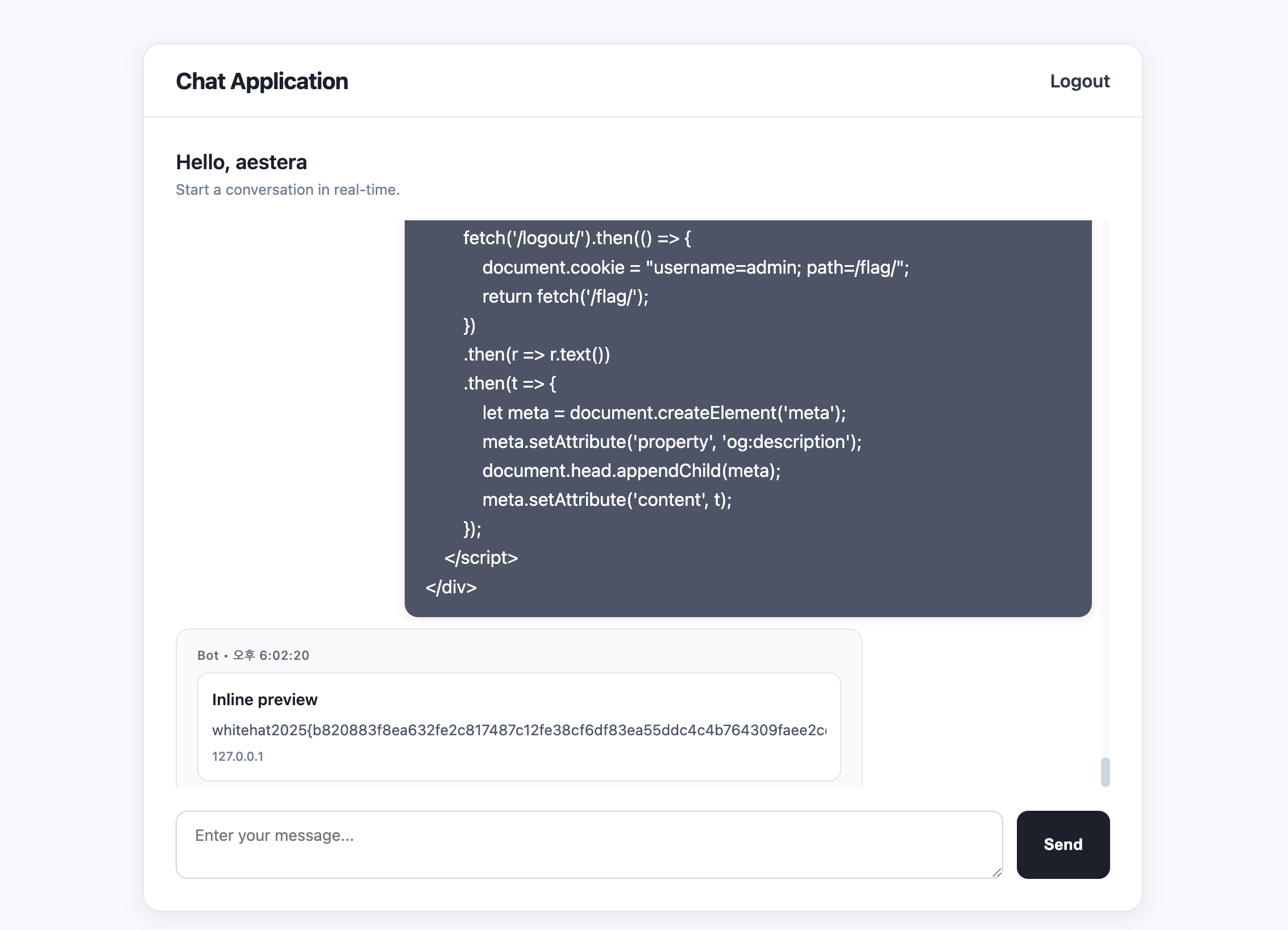 사용자가 메시지를 보낼 수 있는 채팅 애플리케이션에서 인라인 HTML 미리보기 기능의 XSS 를 이용하여 봇(Playwright)을 /logout/으로 로그아웃시켜 기존 쿠키를 제거한 후 username=admin 쿠키를 설정하고 /flag/ 엔드포인트에서 플래그를 가져와 og:description 메타 태그로 탈취하는 문제이다.